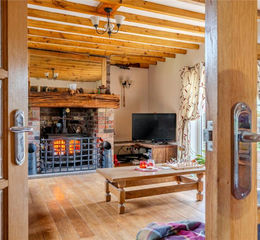 room with wood burner, an L-shaped kitchen/diner,