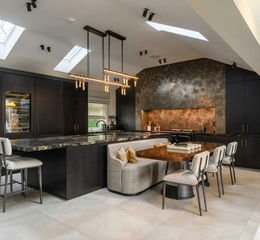 The kitchen forms a striking focal point, with sleek bespoke cabinetry and a substantial island topped in richly veined quartz. Decorated in dark tones, a hand-crafted bronze feature wall brings depth and texture to the space, while an electric AGA and twin Gaggenau ovens offer both everyday practicality and versatility for entertaining. Overhead, a natural quartz crystal pendant chandelier adds a sculptural finishing touch. The open-plan layout extends into a light-filled living area, with an orangery extension crowned with a skylight drawing in garden views. Textured timber panelling frames the media wall.