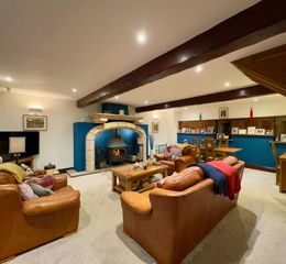 Entering through the front porch,the inner hallway has the staircase leading to the first floor ,stepping left into the main reception room. This impressive room boasts a striking multi-fuel burner set within a large stone feature fireplace beamed ceiling and exposed stonework features. The living room offers excellent versatility, comfortably accommodating lounge furniture, a dining table and even a home-working area. Original mullion windows to the rear further enhance the character of this space.