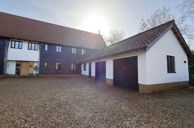 The barn is accessed via a shared driveway from The Common. At the front of the barn is a gravel driveway with space for two vehicles directly in front of the double garage. A five bar gate to the side opens up to a further driveway, leading to a large secure storage shed with power & light. The garden extends beyond with mature shrubs and spring flowers, including snowdrops, a pond and rural views extending from the boundary.