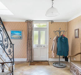 The accommodation extends to around 3,500sq-ft, offering generous and versatile living accommodation which enjoys a high degree of natural light with views over the gardens and fields beyond. Arranged over two floors, the property comprises a large reception hall with pamment flooring and stairs to first-floor with handmade wrought-iron balustrade. The hall leads to an elegant dining room, with two sash windows to the east with shutters and fireplace flanked by shelved storage cupboards.