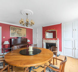 The principal 29’ reception room enjoys a double-aspect, with glazed doors to a large south-facing terrace, with red-brick fireplace housing a built-in log burner, parquet flooring throughout, and wide glazed folding doors to a study, with matching parquet flooring, window to the south and large open fire place with stone surround with storage to the side.