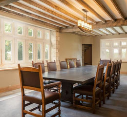 The dining hall lies at the heart of the medieval wing, its history showcased through stone mullion windows, an inglenook fireplace, exposed ceiling beams and a stone-flagged floor concealing the comfort of underfloor heating beneath. In the corner, a striking spiral staircase of stone hewn from a local quarry ascends to the first floor.