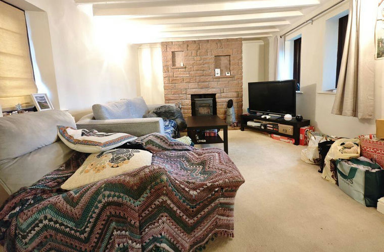 23' 4'' x 11' 8'' (7.11m x 3.55m) Spacious, nicely presented split level lounge with multi fuel stove set in a sandstone inglenook fireplace on a sandstone hearth, painted beams to the ceiling, T.V. and telephone points, two radiators, five uPVC double glazed windows, built in cupboard, door into: