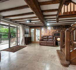 Entrance - With underfloor heated marble tiling, overhead beams and impressive oak staircase to the first floor. This space is open plan into the kitchen diner / family room with glazed double doors to let light flood into the snug and living room.