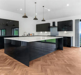 The contemporary kitchen has gloss panelled base and wall cabinetry, quartz work surfaces, integrated appliances, and a substantial island providing additional storage and preparation space. The space is further enhanced by a striking wood-burning stove and wooden herringbone flooring.