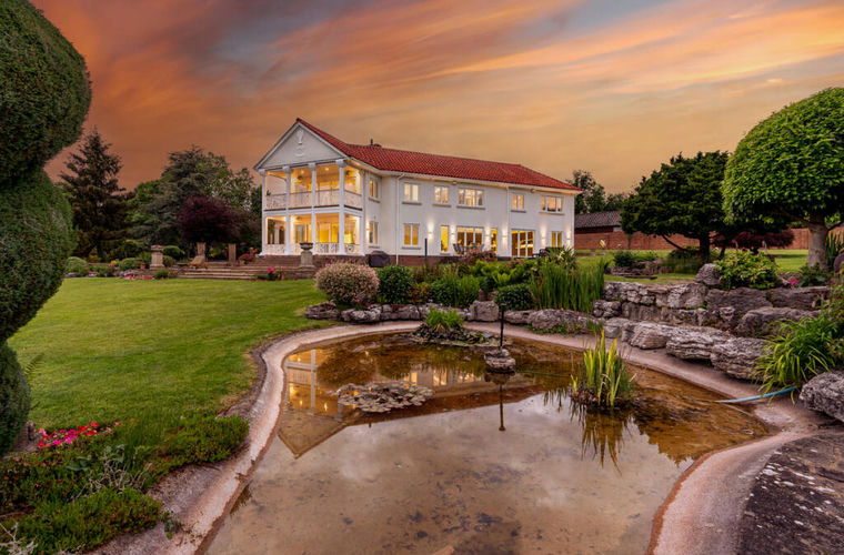 Fugelmere Grange is a magnificent detached home located in Fulmer, Buckinghamshire. The property was built in 1961, incorporating strong aviation themes, with balconies forming a central cockpit and wings extending either side, designed to maximize the south-facing views over its own glorious grounds. Set within the Fulmer conservation area, this unique home combines modern luxury with historical charm.