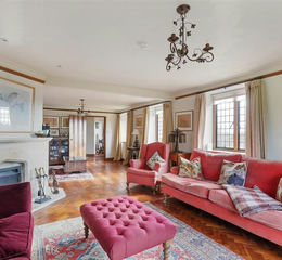The drawing room sits in the west wing of the house and is a spacious room which works equally well for hosting as for everyday living. A striking double-aspect mirrored fireplace forms an intriguing focal point, subtly revealing the room's earlier configuration. A stunning leaded light bay window frames the pretty view of the garden, along with a feature raised platform.