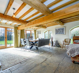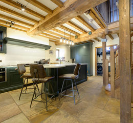 From here, the space transitions into the kitchen - the true heart of the home. Designed and installed by renowned luxury kitchen specialists Tom Howley, the kitchen mirrors the bespoke Shaker cabinetry and quartz countertops. A substantial breakfast bar provides an inviting setting for informal dining and entertaining, while a comprehensive range of integrated appliances includes a dishwasher, wine cooler, combination oven, and induction hob. An oil-fired Rayburn cooker serves as both a practical feature and a characterful focal point, gently radiating warmth and reinforcing the home's heritage. A one-and-a-half ceramic sink with a Quooker boiling water tap further enhances functionality, and there is housing for an American-style fridge/freezer. Overhead, a heavily timbered ceiling adds depth and authenticity, while the flagstone flooring continues through to the first formal reception room, maintaining a cohesive flow.
