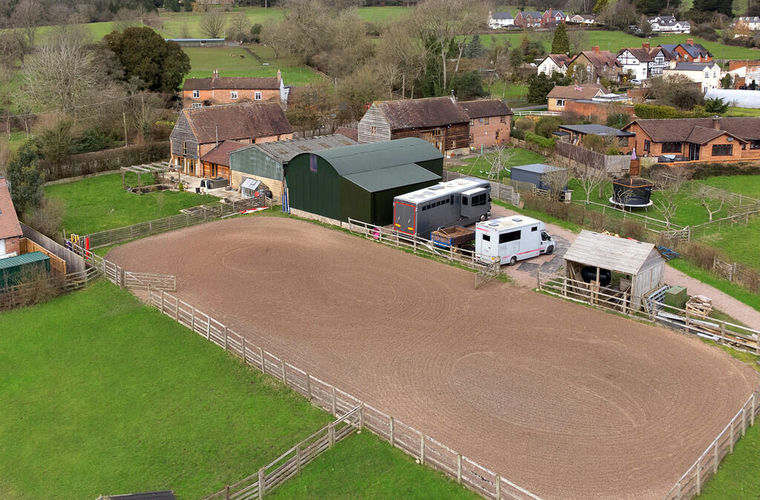 Approximately 10 acres of land, including numerous paddocks - four of which have a mains water supply - Dutch barn with five American-style stables - 20x45m manege - Agricultural barn with mezzanine floor, serving as a workshop & garage - Two double field shelters - Private garden - Secure, gated driveway -