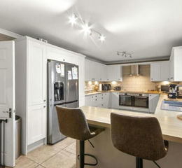 Modern and beautifully styled kitchen refitted in 2018 with a range of wall and base units with soft close doors and drawers, timber effect work surfaces, full housing for American style fridge freezer, integrated dishwasher, self-cleaning double oven with induction hob and extractor fan over, 1 ½ bowl sink with drainer, attractive plinth lighting, partly tiled walls, breakfast bar, tiled floor, double-glazed looks through the conservatory to the countryside beyond.