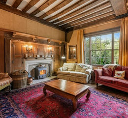 31' 4" x 26' 7" (9.55m x 8.10m) triple aspect with sash windows on two aspects and on third aspect a large 17C iron/leaded window with original shutters, ironmongery, 18C panelling to dado rail. A magnificent brick inglenook fireplace with hood and heavy polished bressummer and exceptional carved structural timbers to ceiling and walls.