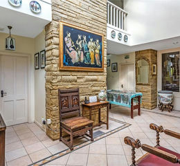 At the heart of the property sits a striking galleried dining hall, a feature that instantly sets the tone and provides a dramatic focal point for the home. It is a space that feels made for welcoming guests, hosting celebrations and creating memorable occasions, while still offering a warm everyday atmosphere. The drawing room is exceptionally spacious and beautifully suited to both relaxed evenings and formal entertaining, with plenty of room for generous seating and an effortless sense of scale.
