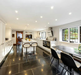 The ground floor reception rooms lead off a grand entrance hall which has been fitted with solid oak flooring. There is an impressive vaulted sitting room with marble fireplace set with a wood burning stove and French doors which open onto the north terrace, a good-sized study with fitted cupboards and shelving, a comfortable family room and formal dining room, situated in the oldest part of the house, perfect for family life and formal entertaining.