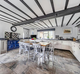 A period red brick farmhouse offers flexible living space that retains period features and potential to enhance with exposed beams, fireplaces and exposed stonework. The kitchen enjoys views to the front and rear with a range of wall and floor cabinets, 1 ½ bowl Belfast sink, Blue Aga, Bosch microwave and double oven and a stone tiled floor.
