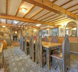 Dimensions: 8.13 x 4.36 (26'8" x 14'3"). The magnificent formal dining room has wallpaper, stone and wood panelling to the walls, flagstone and carpet to the floor, traditional style radiators, wooden double glazed windows and beamed ceiling. Access to the cellar is through the trapdoor in the middle of this room.