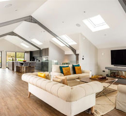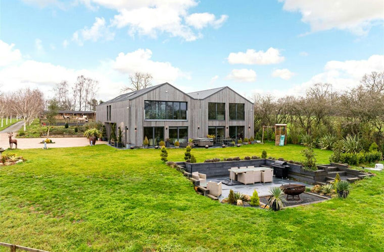 A contemporary equestrian property offering high specification living in an Eco, five/six bedroom Scandi-influenced house with a one bedroom annexe set in 10.35 acres of grounds which include a formal garden, a stable block with a manège, and four fields with far-reaching views of the Vale of Aylesbury and Quainton Hills beyond. All the elevations of this modernist, double-pitched, metal-framed property have vertical external timber cladding and are articulated by full-height sliding or bi-fold doors accompanied by Velux windows. This use of triple glazed glass maximises the ingress of light and allows most rooms to have views of the grounds and the countryside beyond. Converted to high specifications in 2021, the state-of-the-art features of the property provide a contemporary ease of living while being eco-friendly. The modernity of the house is, however, in accord with a quality of life that is closely linked to the rural environment.