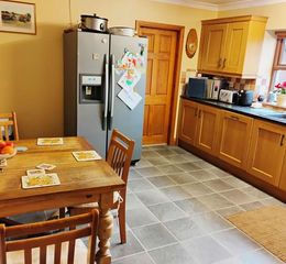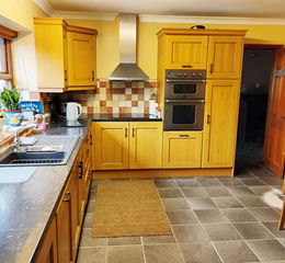 Solid oak fitted kitchen units incorporating stainless steel single drainer sink, built in electric double oven, halogen hob with extractor hood, integrated dishwasher, upright fridge freezer standing area and worksurfaces with tiled splashbacks. Strip light, radiator.