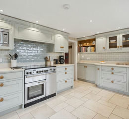 The ground floor includes a welcoming double reception room with a striking inglenook fireplace and log burner, opening directly onto the garden via patio doors. There is a formal dining room and a separate breakfast room. The kitchen has been stylishly refurbished and links to a spacious utility room via a glass walkway. The ground floor also benefits from a cloakroom and a cellar for additional storage.
