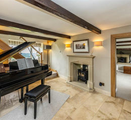 A truly showstopping space featuring a vaulted ceiling with exposed beams, full-height arched barn windows, dual fireplaces including an imposing stone hearth with log burner, and uninterrupted views over the valley. Elegant, spacious, and flooded with light, it is the heart of this magnificent home.