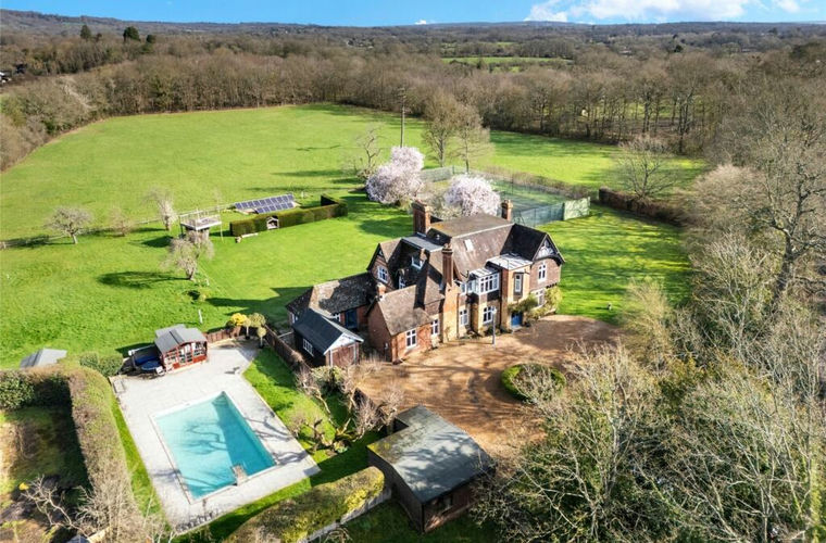 Further reception space includes an elegant dining room with French doors opening to the garden, a double-aspect study and a spacious family room with wood-burning stove, which in turn leads through to the kitchen/breakfast room.