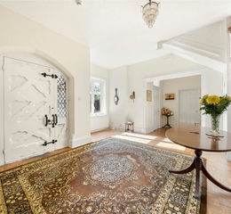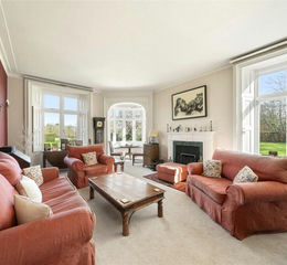 The main drawing room is a particularly charming space, enjoying triple-aspect views across the gardens, an attractive open fireplace and a delightful bright rounded alcove with window seat.