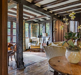 A studded oak door and quaint porch lead you into a dramatic great hall with an impressive central truss and exposed beams. The hall is illuminated by stained glass windows and features a majestic open fireplace and a galleried landing. The ground floor includes a study, an office and a kitchen that combines modern amenities with historic charm. The kitchen leads to an integrated breakfast room and a cosy sitting room with exposed beams, polished floors and an open fire. Upstairs, the accommodation includes several beautifully appointed bedrooms, many with dedicated bathrooms.