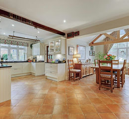 From the entrance porch, the front door opens into a large hallway which leads to all reception rooms and the staircase to the first floor. The ground floor is beautifully light owing to many picture windows and enjoys uninterrupted views over the garden and beyond. The kitchen / breakfast room is a multi-functional room enhanced by vaulted ceilings, a large area to dine or relax, and is fitted with an array of cupboards, an Aga and high-end integral appliances. A door leads to an adjoining utility room with additional storage and pantry. The sitting room is of good proportions and gives access to the sun room which features French Doors that lead out to a discreet terrace. A useful dining room with bespoke cabinetry, and a cloak room complete the