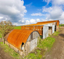 A range of Dutch barns located just North of the entrance drive to the barns where the turns south at an angle of 90° divided into 3 sections staggered up the hill with a lean to on the east side. The buildings are in poor condition with earth floors, steel construction and block & galvanised walls. 64' x 45'