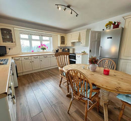 The dual aspect kitchen/breakfast room shares the same outlook and offers cream shaker style units with space for an electric cooker, washing machine, tumble dryer and fridge/freezer, with tiled flooring continuing from the hall.