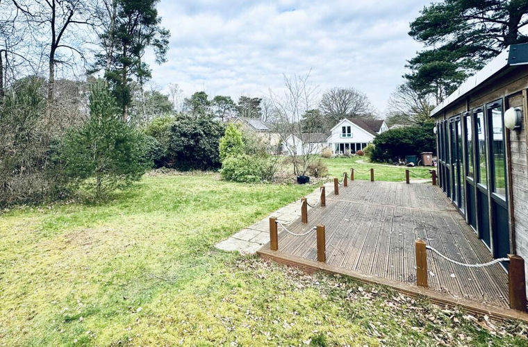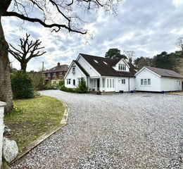 The attractive property frontage is approached through a sweeping driveway onto large off-street parking for a number of cars and leads to the garage. The house is partly screened by mature trees. The grounds surround the house where there is a broad expanse of lawn with well stocked borders and the garden backs onto private owned woodland. Adjoining the rear of the house is a large, paved terrace that extends from the property, offering an ideal setting for 'al fresco' dining in the summer months. The two-acre mature grounds including woodland are fully enclosed by mature trees, providing a high degree of seclusion.
