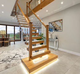 With a stunning bespoke oak and glass staircase with feature lighting leading to the first floor, porcelain tiled flooring following through to the Kitchen and Dining Room. Door to:-