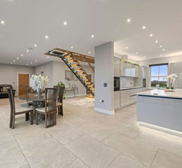 With pvc sash windows to the front and side elevations and fitted with a modern range of high gloss base and wall units with feature cabinet and plinth lighting, Quartz worksurfaces and matching splashbacks, integrated dishwasher, induction hob with extractor hood above and pan drawers, 3 sets of tall units housing 2 built in ovens, a microwave oven and plate warmer and integrated fridge and freezer, wall mounted T.V point. There is a large central island with Quartz worktop, inset 1 1/2 bowl stainless steel sink unit with Quooker tap over, storage cupboards and breakfast bar seating, pop up electric point. Door to Pantry, porcelain tile flooring through to the:-