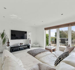 With a set of bi-fold doors opening out onto the sun terrace with views over the garden out towards the sea, karndean flooring, radiator, set of 3 over-table pendant lights.