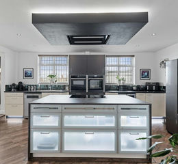 Beautifully fitted with a stylish range of base units with worksurfaces and tiled splashbacks over, sink unit with mixer tap over, built in wine cooler, plumbing for dishwasher, tall units housing an eye level Neff oven combination oven and warming drawer, space for large fridge freezer. A feature "Dekton" central island has illuminated cupboards, an inset Neff induction hob with illuminated canopy and extractor above. Pvc windows to the front elevation, kardean flooring and a step leading up to the:-