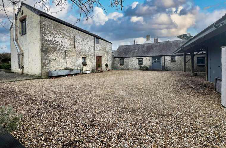 Outside: Enter via a five-bar gate onto a gravel driveway which leads into the courtyard with parking for several vehicles. Within the courtyard is a storage building and carport.