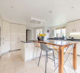 Showcasing striking exposed oak beams, elegant stone and wooden flooring, and an abundance of natural light, this unique home provides versatile living space designed for modern family life.On the ground floor there is plenty of warmth, space, and versatility. The impressive sitting room forms the heart of the home, featuring rich wooden floors, dramatic oak beams, and a charming reading nook. A characterful stone fireplace with an open fire creates a cosy focal point, while bi-fold doors and skylights flood the space with light and open seamlessly onto the patio—perfect for indoor-outdoor living.The spacious kitchen/breakfast/family room is thoughtfully designed for both everyday living and entertaining. It boasts a large central island with breakfast bar, granite worktops, and a full suite of high-spec integrated Miele appliances, including oven, microwave, gas hob, dishwasher, and ample refrigeration with a large fridge and freezer. Recessed spotlighting and stone floors add a sleek finish, while bi-fold doors lead directly to a patio ideal for BBQs and social gatherings. A separate utility room provides further practicality with excellent waste disposal solutions.A particularly attractive feature is the ground floor principal bedroom suite, offering privacy and flexibility. This beautiful room includes a skylight, built-in storage, neutral décor, and views over the courtyard. The en-suite bathroom is beautifully appointed with Mediterranean-style tiles, a bath, and a walk-in shower.