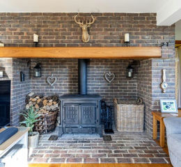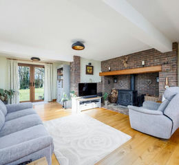 A generous entrance hall offers a bright and welcoming introduction to the home. The triple-aspect living room is a standout feature — brimming with daylight and centred around an impressive inglenook fireplace with exposed brickwork and a log burner. Double doors open seamlessly onto the beautifully maintained gardens, enhancing the connection between indoor and outdoor living.