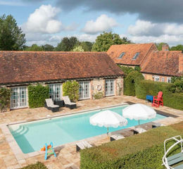Also across the courtyard from the main house is the impressive vaulted barn. Four pairs of French Doors opens to the pool and its enclose terrace. Presently the interior is currently split via striking oak framed sliding glass doors to provide separate entertaining space and a gym. Careful consideration has been give to provide total flexibility and the ability to entertain on a large scale. At the far end, is the pool room, with changing area and cloakroom/wc