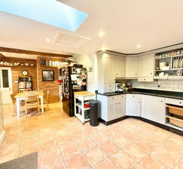 At the heart of the home lies a generous kitchen breakfast room, beautifully appointed with a comprehensive range of wall, drawer, and base units complemented by ample work surfaces. A Range Master cooker takes centre stage, alongside integrated appliances including a fridge, freezer, and dishwasher. Natural light pours in through skylights and front-facing windows, while a door provides direct access outside. The breakfast area offers plenty of space for informal dining, with additional room for further refrigeration or storage if desired. A connecting utility room provides practical space for laundry appliances, further cabinetry, and a stainless steel sink.