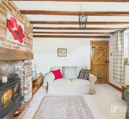 A warm and inviting space featuring a window with bespoke shutters to the front elevation and double-glazed doors providing access to the covered courtyard garden. Character features include exposed beams, a wall-mounted radiator, TV point, and a brick chimney breast housing a gas log-effect fire set on a raised brick hearth.