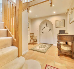 The Linen House itself has been thoughtfully converted from a former working building into a comfortable modern home with good-sized rooms and a practical layout. The central hallway and landing with vaulted ceiling provides a spacious and welcoming entry to the home. In the hallway is a handsome solid oak carpeted staircase and double doors into each of the two reception rooms. These are both a similar size, providing ample space, the sitting room enjoying a feature exposed brick fireplace and chimney with woodburner fitted, timber floors, exposed structural timbers, and triple aspect windows. Recessed lighting and smooth plaster finishes add a more contemporary touch, whilst the massive structural timbers are exposed adding character. The second large reception room with windows to front and rear again with timber flooring and recessed plus picture lighting currently is used as a Study. A door leads into the inner lobby, to a ground floor shower room, then to a well fitted utility room, and into the spacious family dining room/kitchen. This large and well-appointed room, has two velux windows a window to the rear, and two sets of French doors leading to the paved courtyard at the front. The kitchen provides ample space, a Belling range cooker, a large fridge-freezer, dishwasher and good range of cupboard and bench preparation space. There is practical terracotta pamment flooring and plenty of room for a large family dining table and freestanding furniture.