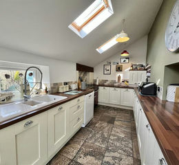 The kitchen has a classic country feel, complemented by three Velux windows above which bring in plenty of natural light throughout the day. To the rear, a porch with a stable door provides direct access out to the garden - a practical and fitting addition to the home.