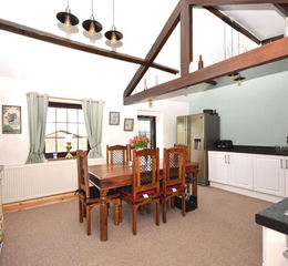 4.06m x 5.08m A range of modern wall and base units with granite effect laminate worksurfaces, tiled splashbacks and a single bowl stainless steel sink with drainer and mixer tap. Range style cooker with cooker hood above. American style fridge/freezer, integrated dishwasher, radiator, exposed beams and purlins. UPVC double glazed window and door to the rear garden and oak doors to ;