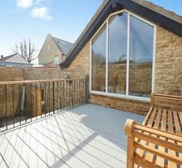 The outdoor space is just as impressive as the interior. The property enjoys a beautifully landscaped garden, thoughtfully designed to provide both privacy and functionality. Primarily laid to lawn with mature planting, the garden bursts with colour throughout the seasons. A paved seating area offers the perfect spot for entertaining, while a hidden courtyard within stone walls creates a tranquil retreat. A raised composite decking area forms an excellent sun terrace, ideal for enjoying warmer months, with additional storage beneath. To the front, the property benefits from a private driveway, securely positioned behind double timber gates, providing off-street parking.