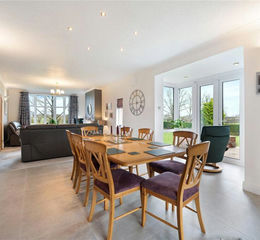 The living kitchen is likely to be the hub of this super family sized home and has a really welcoming feel. The kitchen units are found at the rear of the room with views out to the attractive patio. The units have granite work surfaces and include a breakfast bar. The integrated appliances include dishwasher, double oven, hob with extractor, and a point for a wine cooler fridge freezer. The living space in this room has views to the front of the property and enjoys a gas fire set in a brick surround giving a cosy feel to the room.