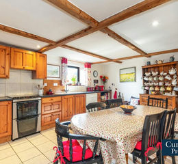 17' 0" max x 14' 0" max (5.18m x 4.27m) Solid wood fitted kitchen incorporating a freestanding electric cooker with gas hob and extractor hood above, plumbing for dishwasher, sink unit with mixer tap, beamed ceiling with spotlights, tiled flooring, double glazed window to the rear, radiator and door to utility.