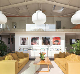 With soaring ceilings, a bright neutral palette, and abundant south-facing glazing throughout, the interiors combine an exceptional sense of verticality and openness, framing views of the surrounding landscapes from nearly every angle of the house.