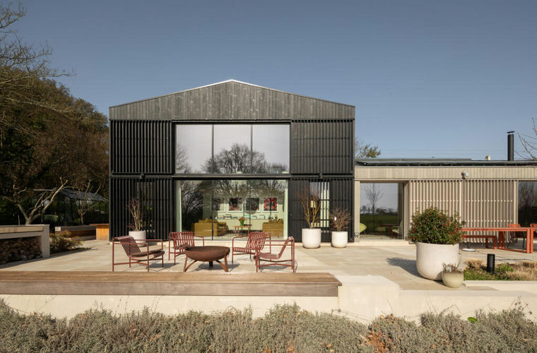 The house consists of two main volumes: one spans a single storey, while the other is set across two storeys and is characterised by a durable steel portal frame with timber frame infills. The façade is balanced by a combination of sleek vertical Siberian larch cladding and oversized glazing, complementing the building’s solid form and clean lines. Ultra-slim profile aluminium sliding doors and well-integrated picture windows provide seamless connections between the house and the landscape.