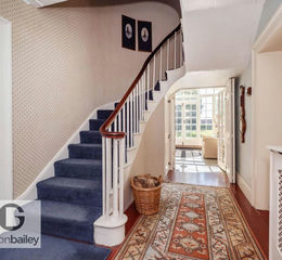 Situated behind a tall brick wall, the house has beautiful front and rear gardens, stocked with mature trees and shrubs and a large lawn.